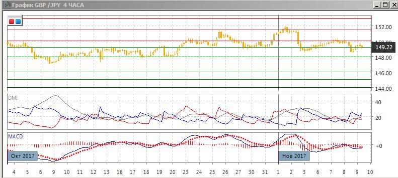На четырёхчасовом графике пара снижается: относительные минимумы и максимумы пары снижаются от 152,00. Последние относительные минимумы пары ниже минимумов в конце октября. По индикаторам направленного движения флэт и в этом масштабе: ADX на низком уровне, гистограмма MACD колеблется около нуля, линия MACD колеблется. Предпочтительным сейчас видится продолжение снижения пары до предыдущих минимумов на 148,60 и далее к уровню поддержки на 148,00.
