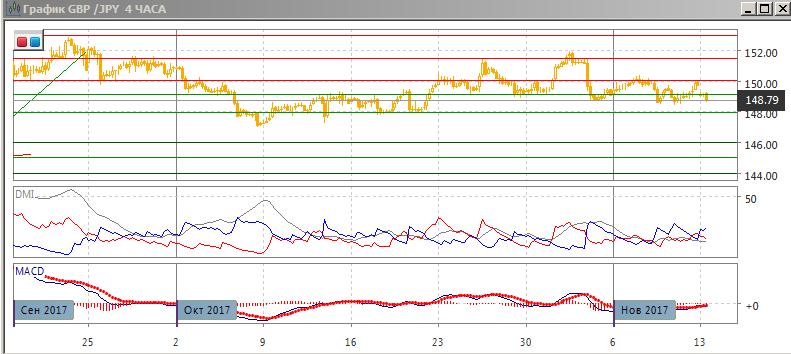 На дневном графике пара осталась ниже предыдущего относительного максимума (выше 150,00), но не преодолела трёх предыдущих относительных минимумов пары ниже 149,15. Формально с конца октября пара перешла к снижению: относительные максимумы и минимумы пары последовательно снижаются. Закрепление ниже 149,15 могло бы зафиксировать разворот, и в этом случае целью снижения виделся бы уровень 147,00 — около минимума октября. По индикаторам направленного движения тенденции нет: DM+ и DM- близки, ADX на низком уровне и продолжает снижаться. Гистограмма MACD около нуля, линия MACD почти горизонтальна.