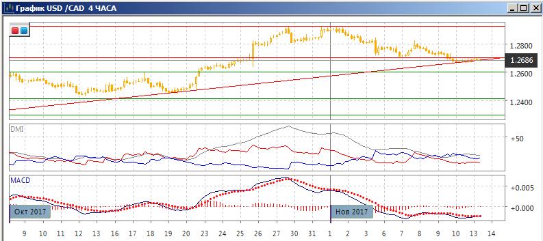 На дневном графике снижение пары от 1,2900 приостановилось у линии восходящего тренда с сентября — это привело к образованию свечи «дожи» в пятницу. Однако пара уже ниже предыдущего относительного минимума и ниже уровня поддержки 1,2700. Последний относительный минимум также ниже предыдущего. Это увеличивает вероятность преодоления линии тренда, так как возможен переход к снижению, или развитию коррекции к росту до уровня сопротивления в октябре (1,2600). Преодоление линии тренда также может быть факторов дальнейшего снижения, если это преодоление произойдёт. Пока можно ожидать поддержки на линии тренда, и рассчитывать на снижение до закрытия ниже преждевременно. По индикаторам направленного движения сохраняется ситуация коррекции к росту: превышение DM+ над DM- значительное и устойчивое, ADX на высоком уровне. Коррекция видна по снижению гистограммы MACD и отрицательному наклону линии MACD.