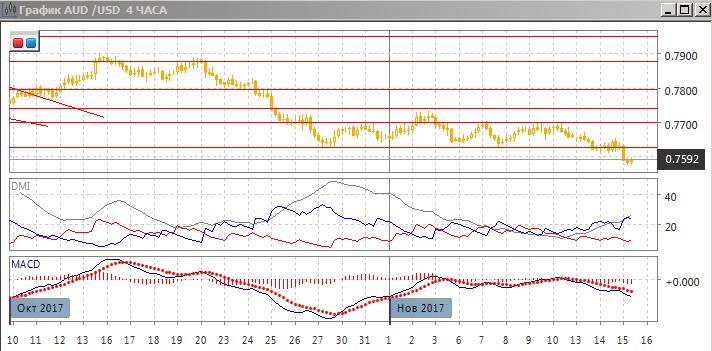 На дневном графике, если ситуация останется как есть с закрытием среды, будет важно изменение ситуации — выход из диапазона с конца октября 0,7625-0,7700. Нижняя граница диапазона несколько раз тестировалась, и теперь, судя по величине движения вниз, может быть прорыв. Это сделало бы более вероятным дальнейшее существенное снижение, так как консолидация в относительно узком диапазоне была относительно долгой. По индикаторам направленного движения ситуация мало изменилась: тенденцией является снижение — DM- значительно выше DM-, при росте ADX, находящемся на высоком уровне. Сохраняется бычье расхождение минимумов пары и гистограммы MACD, что может, потенциально привести к ложному прорыву уровня 0,7625.