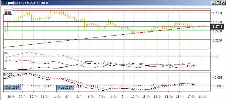 На четырёхчасовом графике пара тестирует линию тренда: отскока вверх не происходит, но и преодоления линии тренда тоже. Ближайшую перспективу, вероятно, определит исход этого тестирования: возвращение к 1,2800 если пара остаётся выше линии тренда, и тестирование 1,2700, при преодолении линии тренда. В более длительной перспективе снижение ниже 1,2700 изменило бы последовательность роста относительных максимумов и минимумов пары, что сделало бы продолжение снижения более предпочтительным. По индикаторам направленного движения идёт переход к снижению: DM- уже выше DM+, гистограмма MACD перешла в отрицательную зону, линия MACD развернулась после роста.