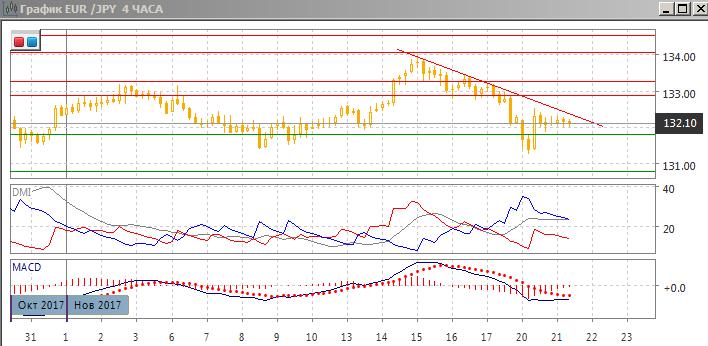 На четырёхчасовом графике снижение ниже поддержки на 131,80 было краткосрочным и завершилось энергичным восстановлением выше 131,80, после этого продолжается консолидация в узком диапазоне выше 131,80. По индикаторам направленного движения — коррекция к снижению: по ADX тенденцией является снижение, DM- устойчиво выше DM+, коррекция видна по росту гистограммы MACD и уменьшению отрицательного наклона линии MACD. Последовательность снижения относительных максимумов пары не нарушена. Пара остаётся ниже линии краткосрочного тренда. Дальнейшее движение скорее будет в сторону выхода из текущей консолидации — либо ниже 131,80, либо выше линии тренда, тогда целью видится сопротивление на 133,25.