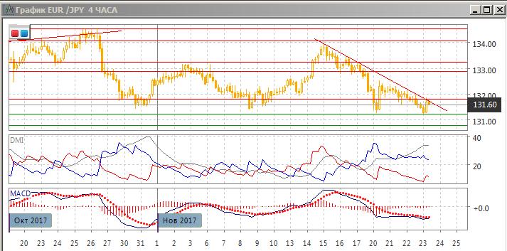 На четырёхчасовом графике сохраняется последовательное снижение относительных максимумов пары от 134,00. Пара остаётся ниже краткосрочного нисходящего тренда с 15 ноября. Линия тренда с уровнем 131,80 сейчас является ближайшим сопротивлением. Образовалось бычье расхождение минимумов пары и гистограммы MACD, что увеличило вероятность отскока вверх с обратным преодолением уровня 131,80. Однако пока пара ниже 131,80 и ниже линии тренда, снижение остаётся предпочтительным. По ADX тенденция снижения сильная: DM- значительное выше DM+ при высоком уровне ADX.