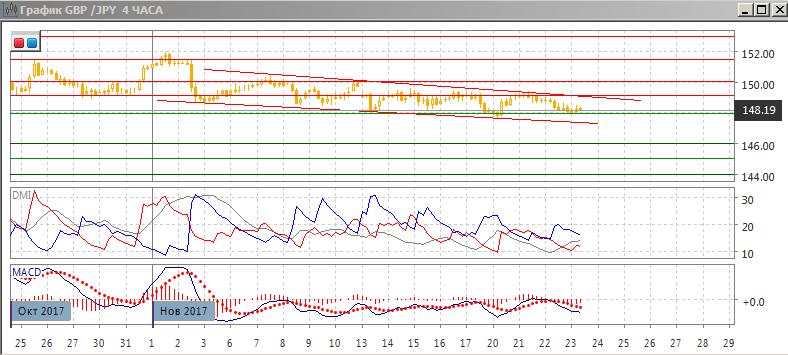 На четырёхчасовом графике пара получила поддержку на уровня 148,00 — около трёх предыдущих относительных минимумов. Однако если рассматривать движение с нисходящем канале, то сейчас предпочтительным видится снижение пары к нижней границе, что будет ниже предыдущего относительного минимума. По индикаторам направленного движения в этом масштабе снижение является слабой тенденцией: ADX на низком уровне, тенденция не подтверждается по гистограмме MACD (колеблется около нуля), и линии MACD (также колебания).