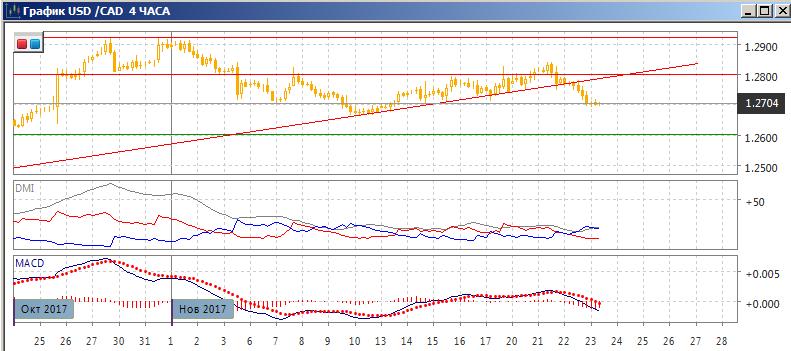 На дневном графике произошло существенное изменение: в среду было закрытие ниже линии восходящего тренда с начала сентября. Это открывает дорогу к дальнейшему снижению пары. В месте с тем, пара пока остаётся выше уровня предыдущего относительного минимума и выше уровня сопротивления на 1,2700 (это также следующий «круглый» уровень ниже 1,2800, который недавно выступал сопротивлением с от которого произошёл откат с преодолением линии тренда. По индикаторам направленного движения — коррекция к снижению: превышение DM+ над DM- остаётся значительным и устойчивым, гистограмма MACD остаётся в отрицательной зоне при снижении линии MACD. Далее 1,2700 поддержка может быть на 1,2600 — там расположен уровень сопротивления на максимумах начала и середины октября.