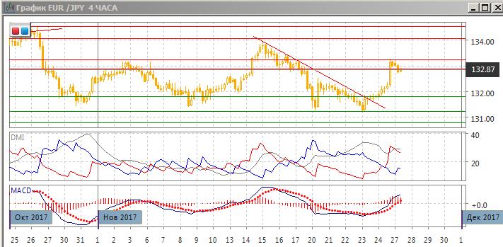 На четырёхчасовом графике пара перешла к росту после преодоления краткосрочной линии нисходящего тренда , что совпало с преодолением уровня 131,80. Пара преодолела предыдущий относительный максимум, по индикаторам направленного движения перешла к росту: DM+ сейчас выше DM-, гистограмма MACD в положительной зоне, линия MACD имеет положительный наклон. Текущее снижение от 133,25 остаётся в рамках коррекционного, и дальнейший рост в этом масштабе кажется предпочтительным с целью на 134,00.
