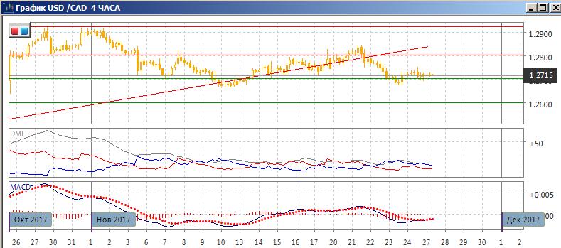 На четырёхчасовом графике происходит коррекция вверх после снижения пары 21-23 ноября, развития отскока вверх не произошло, и скорее пара вернётся к начальной точке коррекции на 1,2675. Пара тестирует сверху уровень 1,2700. Пока более вероятным видится преодоление уровня. По индикаторам направленного движения снижение является слабой тенденцией: DM+ выше DM-, коррекционное движение видно по росту гистограммы MACD к нулевому уровню, и развороту линии MACD.