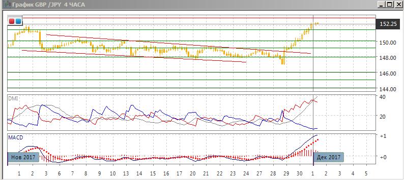 На четырёхчасовом графике пара последовательно растёт, после преодоления уровня верхней границы нисходящего канала с начала ноября и уровня сопротивления 149,15. Сопротивления на 150,00 и 151,50 были преодолены с ходу, ослабления роста пока нет. По индикаторам направленного движения тенденция роста сильная: превышение DM+ над DM- очень большое, ADX растёт, и находится на высоком уровне. Гистограмма MACD находится в положительной зоне, линия MACD имеет положительный наклон.