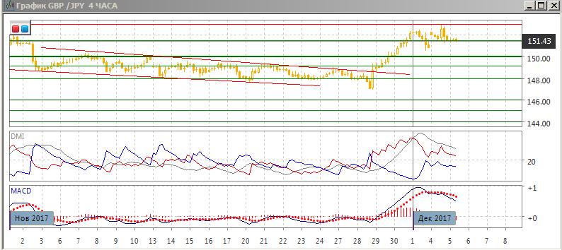 На дневном графике после образования 30 ноября широкодиапазонной свечи пара достигла нового максимума, хотя был коррекция после приближения к уровню 153,00 (около максимума сентября). Пара преодолевала октябрьские максимумы (около 151,50). С одной стороны, пара находится с середины сентября в диапазоне ниже 153 но выше 148 (снижения ниже этого уровня были только краткосрочными). Сопротивление на 153,00 кажется сильным, и около него образовалось бы медвежье расхождение максимумов пары и гистограммы MACD, что делает менее вероятным его преодоление. Таким образом, для того, чтобы рассчитывать на рост выше 153,00, стоит дождаться закрепления выше этого уровня, если это произойдёт. Рассчитывать на снижение пары рискованно, так как пара вышла из нисходящего канала вверх и образовалась широкодиапазонная свеча роста пары.