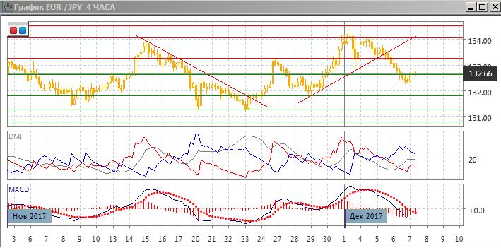 На четырёхчасовом графике происходит небольшой отскок вверх после большой волны безоткатного снижения от 134,00. Пара остаётся ниже сопротивления на 133,25 и ниже уровня на 133 (около относительного минимума 1 декабря). Отскок приостановился, с образованием свечей «дожи», и скорее снижение будет возобновляться. По индикаторам направленного движения тенденцией является снижение: DM- выше DM+, гистограмма MACD остаётся в отрицательной зоне, линия MACD сохраняет отрицательный наклон. Разворота в этом масштабе не видно.