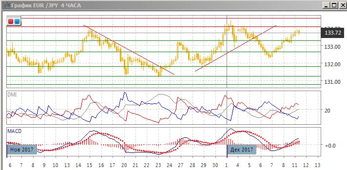 На четырёхчасовом графике пара почти достигла уровня начала снижения от 134,00, и скорее этот уровень будет тестироваться. Однако при этом, скорее, образуется медвежье расхождение максимумов пары и гистограммы MACD, что увеличит вероятность снижения, как и достижение сильного уровня сопротивления. По индикаторам направленного движения тенденцией является рост — DM+ выше DM-, гистограмма MACD растёт в положительной зоне, линия MACD получила положительный наклон. По индикаторам направленного движения пара остаётся во флэте (при волне роста).