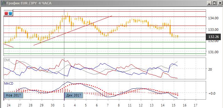 На четырёхчасовом графике продолжилось снижение относительных минимумов пары, был достигнут уровень минимума 6 декабря, от которого был рост к 134,00. Текущая остановка скорее, завершится продолжением снижения — отскока не происходит, что скорее говорит о силе тенденции снижения. По индикаторам направленного движения тенденция снижения сильная: превышение DM- над DM+ большое и увеличивается, линия ADX на высоком уровне и растёт. Гистограмма MACD в отрицательной зоне, линия MACD сохраняет отрицательный наклон.