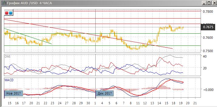 На четырёхчасовом графике происходит консолидация в границах 0,7625-0,7700, центром колебаний является примерно середины диапазона. Так как разворота к снижению не было, выход из консолидации вверх кажется предпочтительными. По индикаторам направленного движения — коррекция к росту: по ADX рост остаётся сильной тенденцией (DM+ существенно выше DM-, линия ADX растёт).