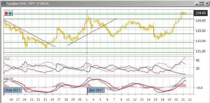На четырёхчасовом графике движение вверх от 132,00 продолжается, после резкого преодоления уровня 134,00 пара консолидируется выше уровня сопротивления 134,50. Относительный максимумы и минимумы пары растут. По индикаторам направленного движения тенденция роста стала сильной: превышение DM+ над DM- большое при высоком уровне и продолжающемся росте ADX, гистограмма MACD в положительной зоне, линия MACD имеет положительный наклон. Выход из консолидации выше 134,50 предпочтителен вверх, в направлении тенденции.