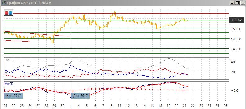 На четырёхчасовом графике пара растёт от 150,00. Она находится около середины канала 150,00-153,00 (пара движется в начала декабря). При волне роста от 150,00 пара преодолела уровень 151,50. В рамках движения в канале предпочтительно движение вверх, но при возвращении ниже 151,50 возможно обратное движение к 150,00. Относительные максимумы и минимумы пары последовательно растут. При выходе выше 152,00 открывается пространство движения к 153,00.