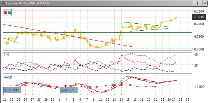 На четырёхчасовом графике продолжается рост пары после выхода из треугольника 14-21 декабря. После остановки пары выше 0,7700 рост пары продолжился и она достигла следующего сопротивления на 0,7740. Продолжение роста является предпочтительным, так как тенденция не изменилась и пара преодолела сильный уровень сопротивления. По ADX тенденция роста сильная: превышение DM+ над DM- большое при высоком уровне ADX. Вместе с тем образовалось медвежье расхождение максимумов пары и гистограммы MACD, что увеличивает вероятность отката (в этом случае поддержки можно ожидать на 0,7700).