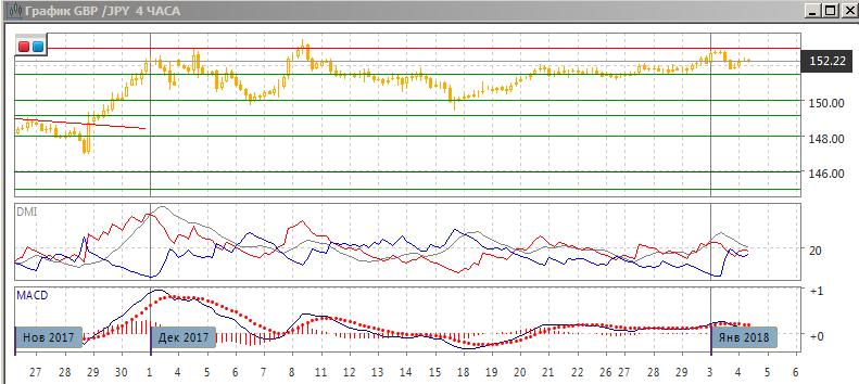В целом ситуация не изменилась — пара остаётся в узком диапазоне выше 151,50. Пара встретила сопротивление на максимумах декабря на 153,00. Большая часть движения от 151,50 до 153,00 была отыграна, и скорее пара достигнет уровня 152,00. Дальнейшее движение скорее будет в направлении выхода пары за границы 152,00-153,00. По индикаторам направленного движения флэт: DM+ и DM- близки, гистограмма MACD около нуля.