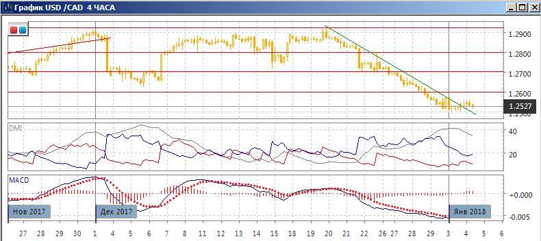 На четырёхчасовом графике снижение приостановилось выше 1,2500, от этого уровня произошёл отскок. Пара находится выше краткосрочной линии нисходящего тренда с 19 декабря. При преодолении нисходящего тренда гистограмма MACD выросла в положительной зоне. Расхождение минимумов пары и гистограммы MACD увеличивает вероятность отскока пары от 1,2500, это соответствовало бы сильному уровню поддержки. При новом снижении к 1,2500, если уровень устоит, может образоваться база для разворота. При преодолении этого уровня открывает пространство для дальнейшего снижения. Ближайшая цель — 1,2500.