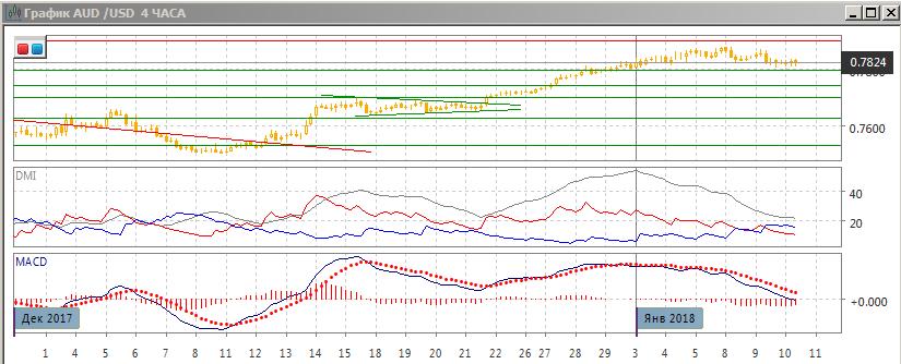 На четырёхчасовом графике пара перешла к снижению: относительные максимумы и минимумы пары последовательно снижаются, по ADX тенденцией стало снижение (DM- выше DM+), гистограмма MACD остаётся в отрицательной зоне, линия MACD сохраняет отрицательный наклон. Снижение медленное, и от 0,7800 может произойти разворот. Выше 0,7800 образовались свечи «дожи» и «падающая звезда», что показывает поддержку у 0,7800.
