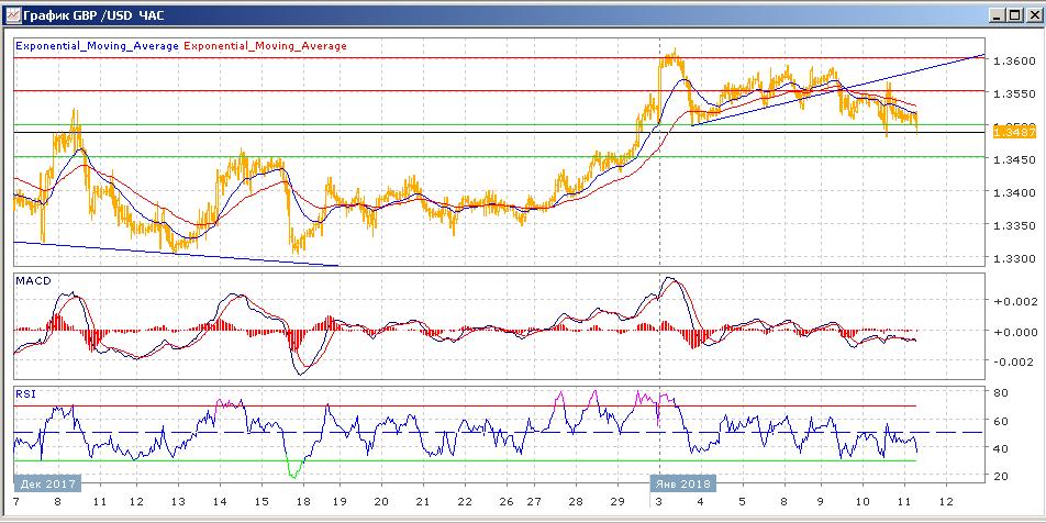 поддержку на 1.3500. Средние скользящие ЕМА21 и ЕМА55 направлены вниз и