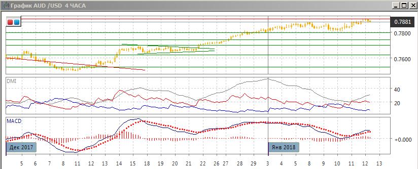 На четырёхчасовом графике пара растёт от 0,7800, относительные максимумы и минимумы растут. По ADX тенденция роста усиливается: превышение DM+ над DM- увеличивается. При этом по гистограмма MACD тенденция не является сильной: гистограмма выше нулевого уровня, но ненамного и не растёт. Достаточного импульса для преодоления 0,7900 сейчас не видно — и рассчитывать на рост стоит только при преодолении уровня 0,7900, до этого высока вероятность отката.