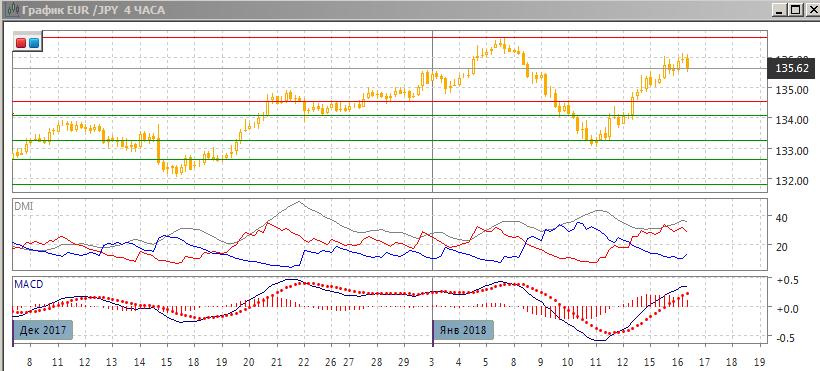 На четырёхчасовом графике пара растёт, хотя рост начинает замедляться. Последовательность роста относительных максимумов и минимумов пары сохраняется. Замедление пары видно по образованию медвежьего расхождения максимумов пары и гистограммы MACD, что увеличивает рост снижения с преодолением уровня поддержки на 135,60. По ADX рост является хорошо выраженной тенденцией. От 136,00 пара откатилась два раза, во второй образовалась небольшая «падающая звезда», что усиливает сопротивление на уровне. Скорее, далее движение в краткосрочном периоде будет в сторону выхода пары за границы 135,60-136,00.