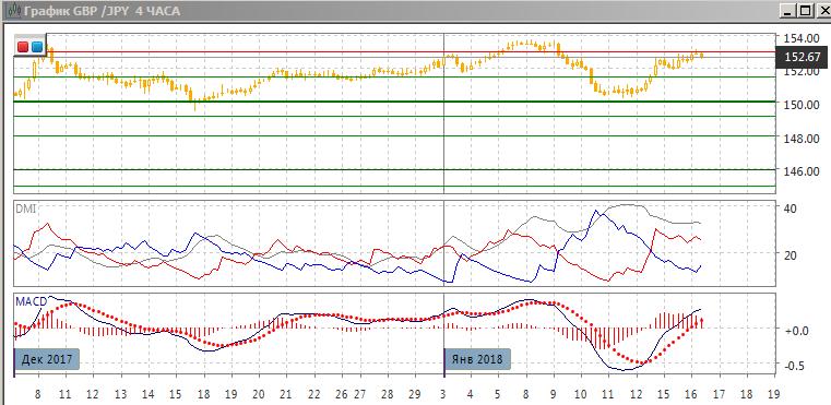 На четырёхчасовом графике произошёл разворот к росту с образованием базы выше 150,00. Рост сейчас замедляется (это видно по снижению гистограммы MACD), новые максимумы пары по MACD не подтверждаются, что увеличивает вероятность отката от 153,00. По ADX тенденция роста остаётся достаточно сильной: превышение DM+ над DM- большое, ADX на высоком уровне. Пока пара ниже 153,00, краткосрочно откат к 152,00 кажется более предпочтительным. Далее предпочтительным видится движение в сторону выхода из диапазона 152-153.