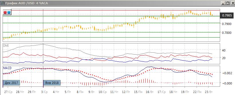На четырёхчасовом графике рост приостановился — последний относительный максимум уже ниже предыдущего, по гистограмме MACD в отрицательной зоне и отрицательному наклону линии MACD краткосрочной тенденцией является снижение (или коррекция). По ADX превышение DM+ над DM- сохраняется, но оно уже небольшое, и тенденция близка к изменению. Дальнейшее движение пары,скорее, будет в направлении выхода пары из консолидации в границах 0,7975-0,8040.