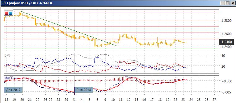 На четырёхчасовом графике пара остаётся в канале с 15 января 1,2400-1,2450. В рамках движения в канале целью видится нижняя граница, так как пары достигла верхней и снижается. По индикаторам направленного движения флэт: DM+ и DM- близки при низком уровне ADX, гистограмма MACD колеблется около нуля, линия MACD близка к горизонтали. Пока стоит подождать выхода из канала и действовать в этом направлении.