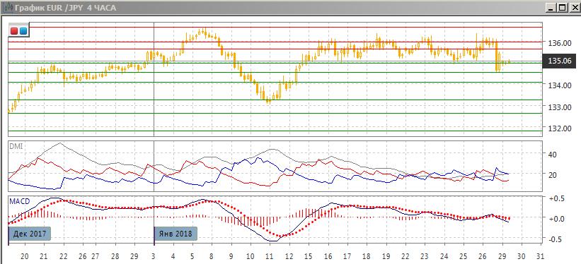 На четырёхчасовом графике пара вышла и диапазона вниз, после чего отскок вверх от уровня поддержки 134,50 приостановился у 135,00 (нижней границы диапазона). При возвращении пары в диапазон образовалась бы картина «ложного пробоя», и более вероятным видится возвращение к верхней границе на 136,00. Если пара остаётся ниже 135,00, более вероятным видится продолжение снижения. По индикаторам направленного движения флэт: DM+ и DM- пересекаются, гистограмма MACD колеблется около нуля, линия MACD близка к горизонтали.