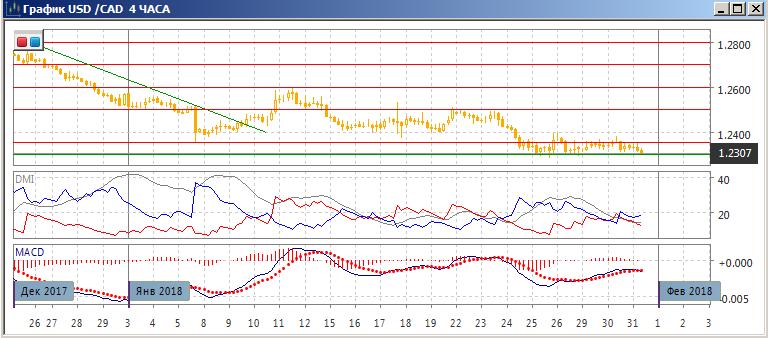 На четырёхчасовом графике пара остаётся в узкой консолидации 1,2300-1,2355. Так как пара относительно долго торгуется в узком диапазоне, то выход из него может быть энергичным. Более вероятным видится продолжение движения в направлении выхода пары из канала (предпочтительно снижение, так как это продолжение предшествующей тенденции). По индикаторам направленного движения флэт: DM+ и DM- близки, гистограмма MACD около нуля, линия MACD близка к горизонтали.
