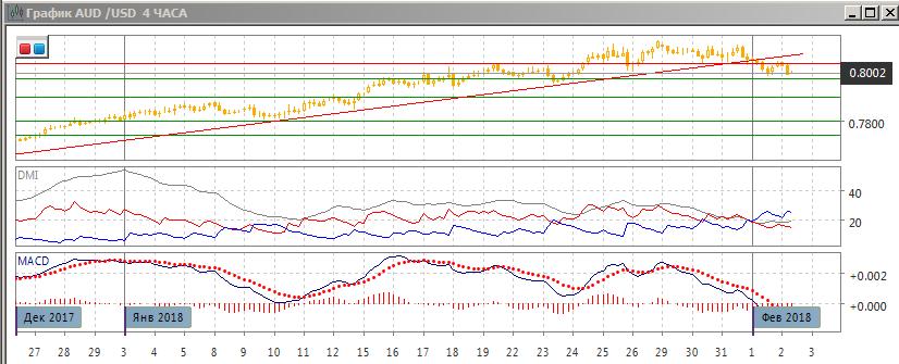 На четырёхчасовом графике пара перешла к снижению: относительные максимумы и минимумы пары последовательно снижаются, пара преодолела поддержку на уровне 0,8040 и в начале 2 февраля она выступила уже сопротивлением при отскоке вверх. Пара закрепилась ниже линии восходящего тренда. По индикаторам направленного движения тенденцией стало снижение: DM- уже выше DM+, гистограмма MACD находится в отрицательной зоне, линия MACD сохраняет отрицательный наклон.
