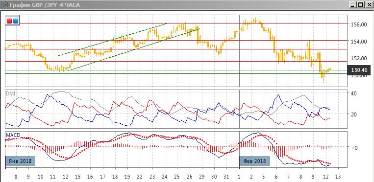 На четырёхчасовом графике происходит отскок вверх после снижения пары до 149,00, когда пара преодолела уровень поддержки на 151,50 9 февраля. Если рост продолжится, вероятно сопротивление на этом уровне. Размер отскока небольшой, и более вероятно, что снижение возобновится с ближайшей целью на 149,00. По ADX тенденцией остаётся снижение: DM- выше DM- при высоком уровне ADX.