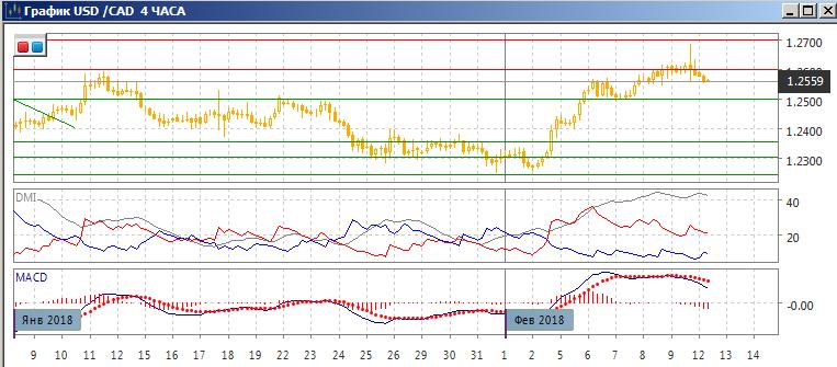 На дневном графике рост пары продолжился, и она приблизилась к следующему «круглому» уровню на 1,2700. Это сильный уровень сопротивления (ранее в ноябре-декабре он был поддержкой для пары). При том, что размер роста пары от 1,2240 относительно велик, вероятно откат будет сильнее, в этом случае поддержки можно ожидать на 1,2500 - «круглом» уровне и около максимумов середины января. По индикаторам направленного движения тенденция роста сохраняется: DM+ выше DM- , гистограмма MACD в положительной зоне, линия MACD сохраняет положительный наклон.