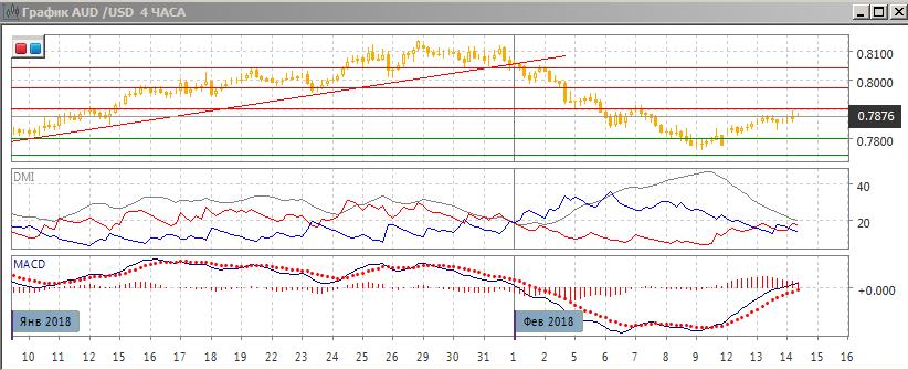 На четырёхчасовом графике продолжается рост пары от 0,7760, при этом рост замедляется. Образовалось медвежье расхождение максимумов пары и гистограммы MACD, что укрепляет сопротивление на ближайшем «круглом» уровне 0,7900. Относительные максимумы и минимумы пары продолжают расти. Сопротивление на 0,7900 соответствует максимумам 6-7 февраля. Более предпочтительным видится возвращение к 0,7800.
