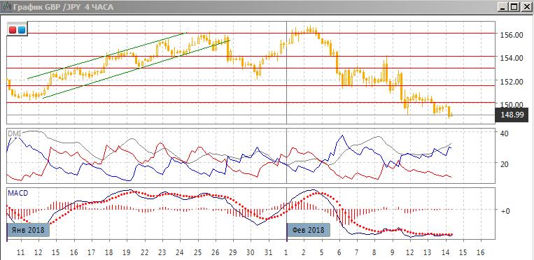 На четырёхчасовом графике продолжается последовательное снижение относительных максимумов и минимумов пары от 154,00. Темп снижения замедляется: новые минимумы пары не подтверждаются по гистограмме MACD (образовалось бычье расхождение). По ADX тенденция снижения увеличивается: превышение DM- над DM+ увеличивается при росте ADX.