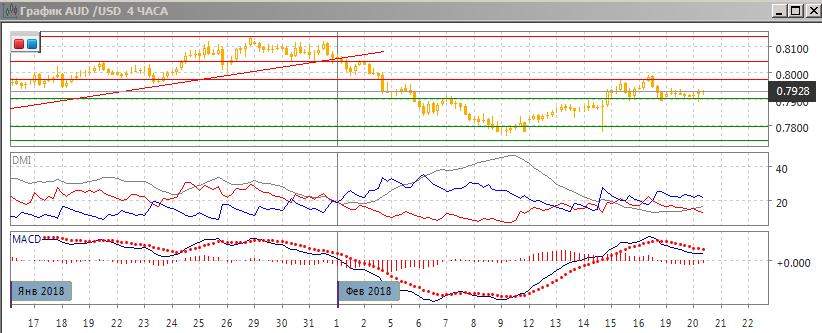 На четырёхчасовом графике пара получает поддержку на 0,7900, около этого уровня образовалось около трёх относительных минимумов. Около уровня 0,7900 были относительные максимумы и минимумы с начала февраля. Последовательность роста относительных максимумов и минимумов пары нарушена, что может привести к развороту при преодолении уровня уровня 0,7900. При преодолении уровня 0,7900 открылась бы дорога для снижения до следующего сильного уровня поддержки 0,7800.
