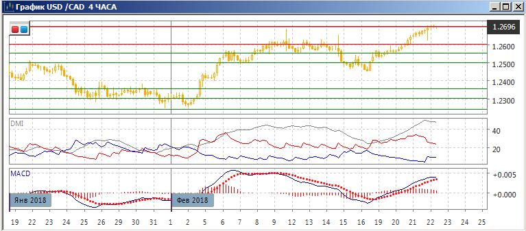 На четырёхчасовом графике развернулась после того, как ранее образовалась плоская вершина. С 16 февраля относительные максимумы и минимумы пары растут, был преодолён важный уровень 1,2555. Признаком разворота пока не видно, и после преодоления уровня сопротивления 1,2600 рост скорее всего будет продолжаться. Образование «молота» в конце среды подтвердило отсутствие поддержки для снижения.
