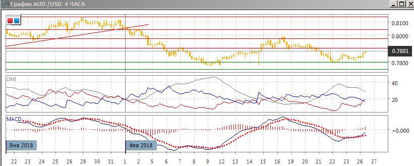 На четырёхчасовом графике пара стабилизировалась после снижения от 0,8000. Относительные максимумы и минимумы пары сейчас растут от 0,7800. Потенциально у 0,7800 может образоваться двойное дно, это делает ближайшей целью, в случает перехода в горизонтальный канал, зону около 0,8000. По индикаторам направленного движения пара в этом масштабе перешла к росту: гистограмма MACD растёт в положительной зоне, линия MACD развернулась, DM+ сейчас стала выше DM-.