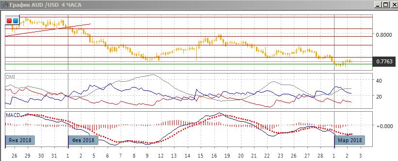 На четырёхчасовом графике отскок вверх от 0,7740 остановился с приближением к уровню 0,7800. Относительные максимумы и минимумы пары продолжают снижаться. Пара преодолела относительный минимум 8-9 февраля, что убирает поддержку на этом уровне. В этом масштабе также продолжение снижения выглядит предпочтительным пока пара ниже 0,7800.