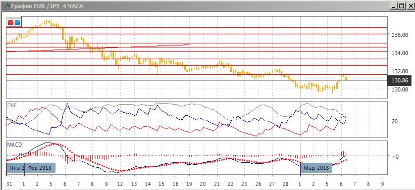 На четырёхчасовом графике пара перешла к росту: преодолены последние относительные максимумы пары, по индикаторам направленного движения тенденцией стал рост: DM+ теперь выше DM-, гистограмма MACD растёт в положительной зоне, линия MACD получила положительный наклон. Пока пара не преодолела сильного уровня сопротивления на 131,50, рассчитывать на продолжение роста кажется преждевременным, и пока предпочтительным видится возобновление снижение к 130,00.