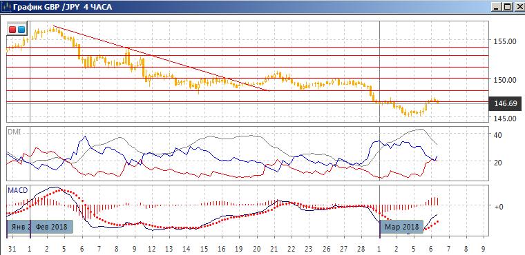 На четырёхчасовом графике рост от 145,00 приостановился на 147,00, пара не преодолела относительный максимум в начале марта. По ADX перехода к росту не произошло, хотя рост гистограммы MACD в положительной зоне и положительный наклон линии MACD соответствует отскоку. Пока пара не закрепилась выше 147,00, краткосрочно предпочтительным видится снижение.