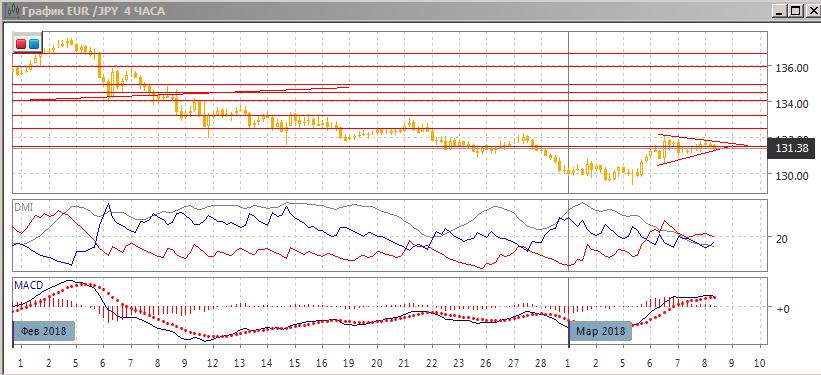 На четырёхчасовом графике после достижения уровня 132 образовался треугольник, в направлении выхода из которого, вероятно, и будет продолжение движение. В случае выхода вниз цель — 130,00, уровень поддержки в начале марта от которого произошёл разворот. При выходе вверх возможная цель — 133,25, сопротивление в середине февраля.