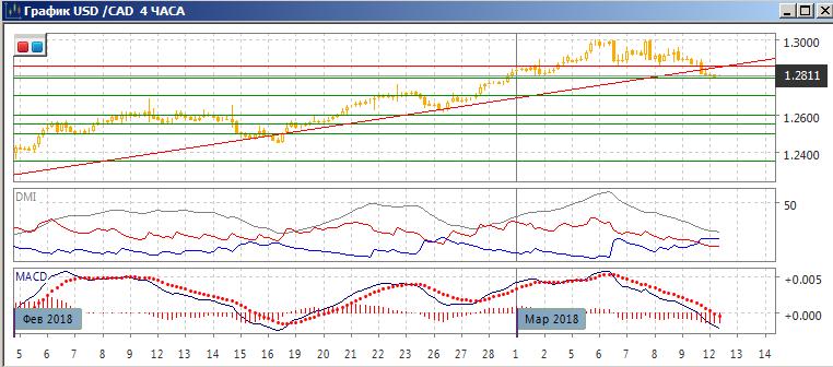На четырёхчасовом графике пара преодолела промежуточный минимум на двойной вершины, которая образована у 1,3000, на 1,2865. Подтверждение модели двойной вершины совпало с преодолением восходящей линии тренда. Относительные максимумы и минимумы пары последовательно снижаются от 1,3000. По индикаторам направленного движения пара перешла к снижению — DM- уже выше DM+, гистограмма MACD снижается в отрицательной зоне, линия MACD сохраняет отрицательный наклон. Цель снижения может быть к 1,2730 по модели двойной вершины.