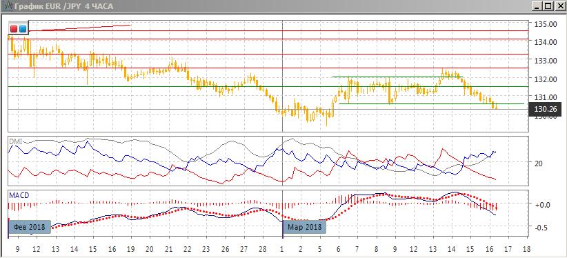 На четырёхчасовом графике аналогичная картина: пара после консолидации выше 132,00 вернулась в канал, после чего снизилась ниже нижней границы на 130,50. Исходя из размера канала в 150 пунктов, целью снижения может быть уровень 129,00. По индикаторам направленного движения тенденцией стало снижение: превышение DM- над DM+ большое и увеличивается, ADX на высоком уровне и растёт. Гистограмма MACD остаётся в отрицательной зоне, линия MACD имеет отрицательный наклон. Уровень 130,50 можно рассматривать как ближайшее сопротивление после того, как он был преодолён. Пока пара ниже 130,50, дальнейшее снижение кажется предпочтительным.