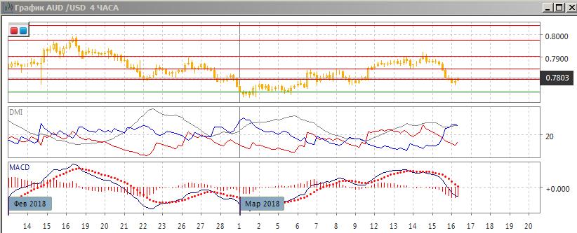 На четырёхчасовом графике пара перешла к снижению после преодоления уровня поддержки на 0,7850. Это нарушило последовательность роста относительных максимумов и минимумов пары, а также возвратило пару ниже ранее преодоленного сопротивления, которое тестировалось 6-9 марта. По индикаторам направленного движения тенденцией стало снижение: DM- выше DM+, гистограмма MACD в отрицательной зоне, линия MACD имеет отрицательный наклон. Пара сейчас выросла снизу до ранее преодоленного уровня поддержки на 0,7800, здесь можно ожидать возобновления снижения, так как это сильный уровень поддержки/сопротивления, но при снижении он был преодолён сходу. Целью текущего движения видится возвращение к уровню поддержки начала марта на 0,7740.