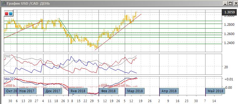 На дневном графике пара достигла нового максимума, закрытие в четверг было выше психологически важного уровня 1,30, при этом пара преодолела максимумы начала марта. Последовательность роста относительных максимумов и минимумов пары сохраняется. Пара остаётся выше линии тренда, если строить его с начала февраля. Рост, однако, замедляется: образовалось медвежье расхождение максимумов пары и гистограммы MACD. Однако пока разворота не было, и подтверждения сигнала в виде преодоления линии тренда и уровня 1,30, продолжение роста видится предпочтительным. По ADX тенденция роста остаётся очень сильной: превышение DM+ над DM- очень большое, ADX на высоком уровне и продолжает расти.