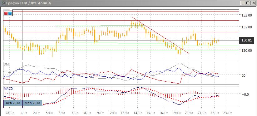 На четырёхчасовом графике пара тестирует уровень 131,00 (19 и 21 марта). По индикаторам направленного движения выраженной тенденции нет: DM- и DM+ близки, ADX на низком уровне, гистограмма MACD около нуля, линия MACD почти горизонтальна. Сопротивление на 131,00 примерно соответствует уровню поддержки в начале марта. Перехода к снижению пока не было: пара нашла поддержку у 130,30. Скорее, в более вероятен новый откат к 130,30 после тестирования уровня 131,00. Дальнейшее движение, вероятно, будет в сторону выхода пары либо выше 131,00, либо ниже 130,00.