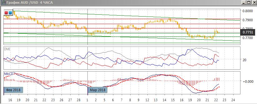 На четырёхчасовом графике рост от 0,7700 был ограничен ниже 0,7800, ниже этого уровня образовалась разворотная свечная комбинация с «падающей звездой». Это предполагает, что более вероятно возвращение пары к уровню 0,7700. По индикаторам направленного движения пара перешла к росту, но для него, вероятно, требуется, чтобы пара оставалась выше уровня 0,7740 (поддержка в начале марта и сопротивление 19 марта).
