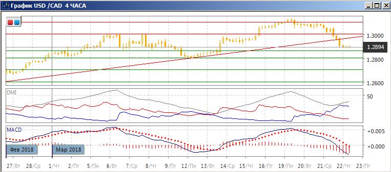 На четырёхчасовом графике пара после тестирования уровня 1,3100 перешла к снижению, был преодолён «круглый» уровень 1,3000. По индикаторам направленного движения тенденция снижения усиливается: превышение DM- над DM+ увеличивается, гистограмма MACD продолжает снижение в отрицательной зоне, линия MACD увеличивает отрицательный наклон. В начале четверга произошла остановка снижения выше уровня 1,2865 (это уровень поддержки/сопротивления 1-13 марта). Отсутствие отскока вверх после вызванного новостями снижения (при общем снижении курса доллара США) скорее говорит от отсутствии поддержки для роста, и продолжение снижения видится более вероятным.